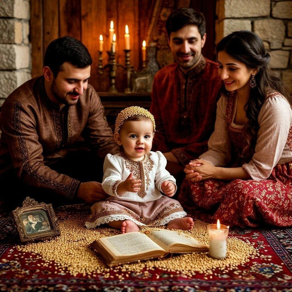 В этот особенный день перед малышом рассыпали зерно пшеницы и посыпали голову сладким сахаром — таким образом выражая пожелание богатой, сытой и благополучной жизни впереди. Затем клали перед ребёнком особые вещи-символы, определяющие дальнейший жизненный путь человека. Если это была девочка, ей предлагалось выбрать между двумя предметами: зеркалом и книгой. Если мальчик — между кинжалом и той же книгой. Именно выбранный предмет считался судьбоносным знаком, определяющим характер, склонности и профессиональный путь ребёнка в будущем.