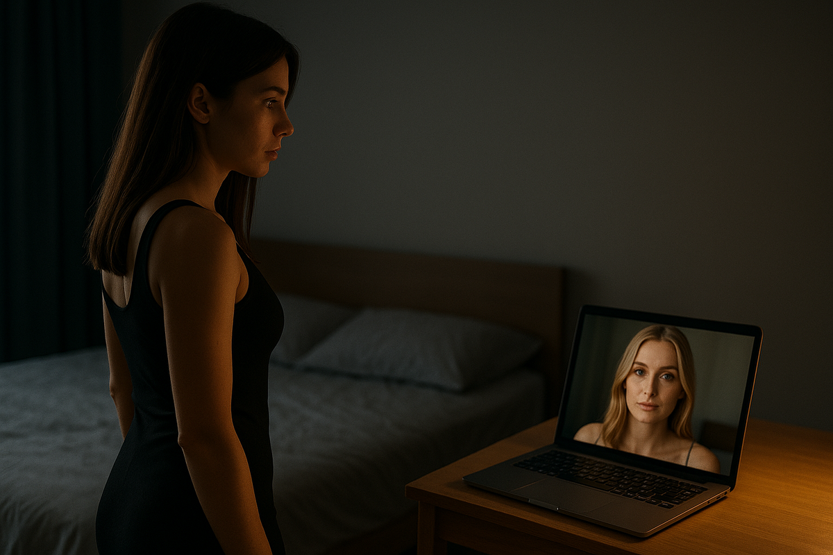 На экране — женщина. Молодая, ухоженная, в шёлковом халате, который скользил по одному плечу. Она сидела с бокалом вина и что-то вполголоса напевала.