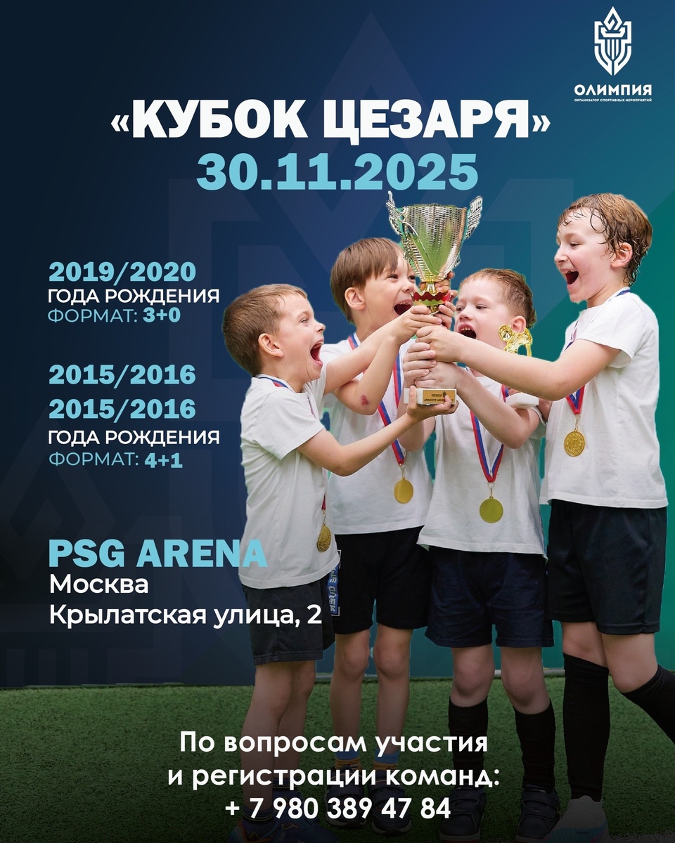ТУРНИР ДЛЯ ДЕТЕЙ НАЧАЛЬНОЙ И СРЕДНЕЙ ПОДГОТОВКИ КОМАНД 🏆 ⚡️КУБОК ЦЕЗАРЯ 30.11 ✅ 2019/2020 (формат 3/0) ✅ 2015/2016 (формат 4+1) средний уровень ✅2015/2016 (формат 4+1) начальный уровень ⚽️Игры будут проходить на ДВУХ полях, что значительно увеличит интенсивность и пауз станет намного меньше! 🏅Обновленные награды, уникальные медали, новые номинации и многое другое ждет ребят на турнирах! Награждается каждый участник игр! Лучшие игроки команд, турнира, вратарь и бомбардир всего турнира. 📸На каждом турнире работает фотограф, который сможет сделать снимки лучших моментов игр и награждения! Так же каждый турнир проходит с музыкальным сопровождением и с праздничным настроением! 🅿️ Для родителей доступна бесплатная парковка, а так же кафе на территории манежа! ⏰Начало турнира: ✅ 2019/2020 — начало турнира в 15:15 ✅ 2015/2016 — начало турнира в 16:45 ✅2015/2016 — начало турнира в 18:45 Более подробная информация и запись по телефону: +79803894784 Максим.