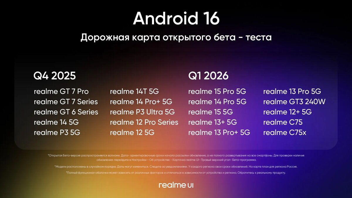 Всем, привет друзья! Пришло время нового, или хорошо забытого старого)) то, что приходит каждый год под Новый Год! Это новая версия realme UI и новая версия Android! 16 по счету 🎉🎉🎉 знаю многие уже заждались, самое главное в спойлерах под баннером! ЧИТАЕМ ВНИМАТЕЛЬНО! Прошу обратить внимание на дисклеймеры! ТАМ БОЛЬШИНСТВО ОТВЕТОВ НА ВАШИ ВОПРОСЫ! *Открытая Бета-версия распространяется волнами. Дата- ориентировочная начала рассылки обновления, а не полного развертывания на все смартфоны. Для проверки наличия обновления- перейдите в Настройки- Об устройстве- Карточка realme UI- Правый верхний угол- Бета-программа. *Модели расположены в случайном порядке. Даты могут измениться. Следите за уведомлениями. У каждого региона свои сроки обновлений. На карте план для региона Россия. *Полный функционал оболочки может зависеть от различных факторов и отличаться в зависимости от устройства и региона. Обратитесь к реальному продукту. Модель realme 15T не добавлена в план, но ожидается в конце п