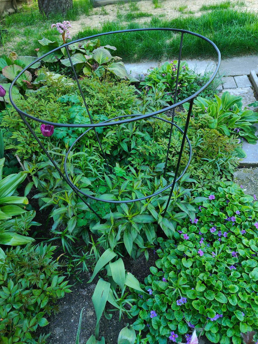 У меня тенистый участок, поэтому многим растениям в саду не хватает света. Они, как могут, пытаются этому противостоять - вытягиваются, ловя солнечные лучи. У высоких многолетников изгибаются побеги, кусты норовят развалиться. Поэтому очень многое в саду приходится подвязывать. Добавляет проблемы очень плотная посадка. Площадь участка маленькая, а посадить хочется многое, поэтому выходом из положения является уплотнение цветников. Да ещё к тому же, давно посаженные многолетники разрослись, им тесно, они конкурируют с растениями-соседями за место под солнцем - и в прямом, и в переносном смысле слова. Я давно смирилась с этой данностью и нашла более-менее приемлемый выход: подвязываю растения к палочкам-опорам. Такие приспособления давно продаются в садовых магазинах. Подробно про это я писала в своей старой статье: Время идёт, многолетники разрастаются, огромные кусты флоксов и пионов уже неудобно подвязывать к палочкам-опорам. Нужно искать какой-то другой вариант их поддержки. Зимой