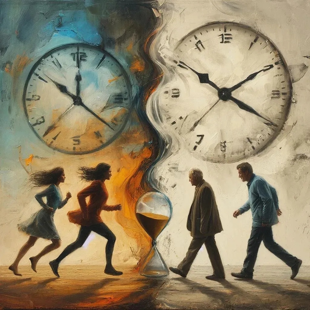 Бежали раньше мы, а время шло за нами. А вот сейчас плетёмся, а оно бежит. И вот, когда его не чувствуем ногами, Оно нас, как и прежде, гонит и спешит. Оно не дремлет, не стоит на остановках, И безразлично к нашей суете сует. А мы, в своих делах погрязшие неловко, Не замечаем бега времени. Но нет! Идут минуты, превращаясь в дни и годы, В десятки лет, а после в вечность перейдя. Но время не зависит от плохой погоды, Оно не ждёт, куда бы ни послать тебя. А мы бежим, не успевая за годами, Которых нам не повернуть обратно вспять. И только время управляет всеми нами, А мы боимся это время потерять. Мы говорим ему: " Постой! Остановись же! Давай с тобой поговорим о чём-нибудь!" А время говорит: " Вы что, сдурели, вижу! Я не могу вам ничего назад вернуть". Бежали раньше мы, а время шло за нами. Теперь плетёмся мы, а время всё бежит. Но мы его уже не чувствуем ногами, И не спешим. И не боимся, что сбежит.
