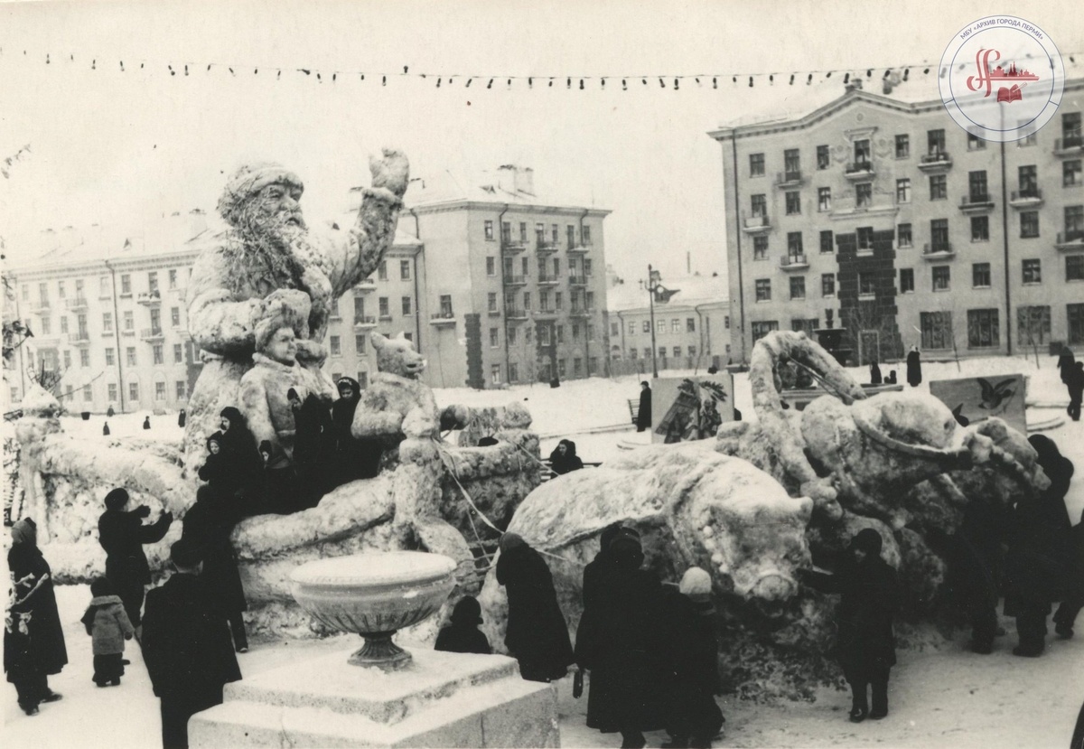 Снежные скульптуры (фигуры Деда Мороза, Снегурочки и лисы, в запряжённых лошадьми санях) у ДК им. И. В. Сталина (ныне ДК им. А.Г. Солдатова). Дата съемки: январь 1956 год Автор фото: В.В. Реймерс Архив города Перми #Пермь #ИсторияПерми #ПрошлоеПерми #СтараяПермь https://vk.com/oldperm