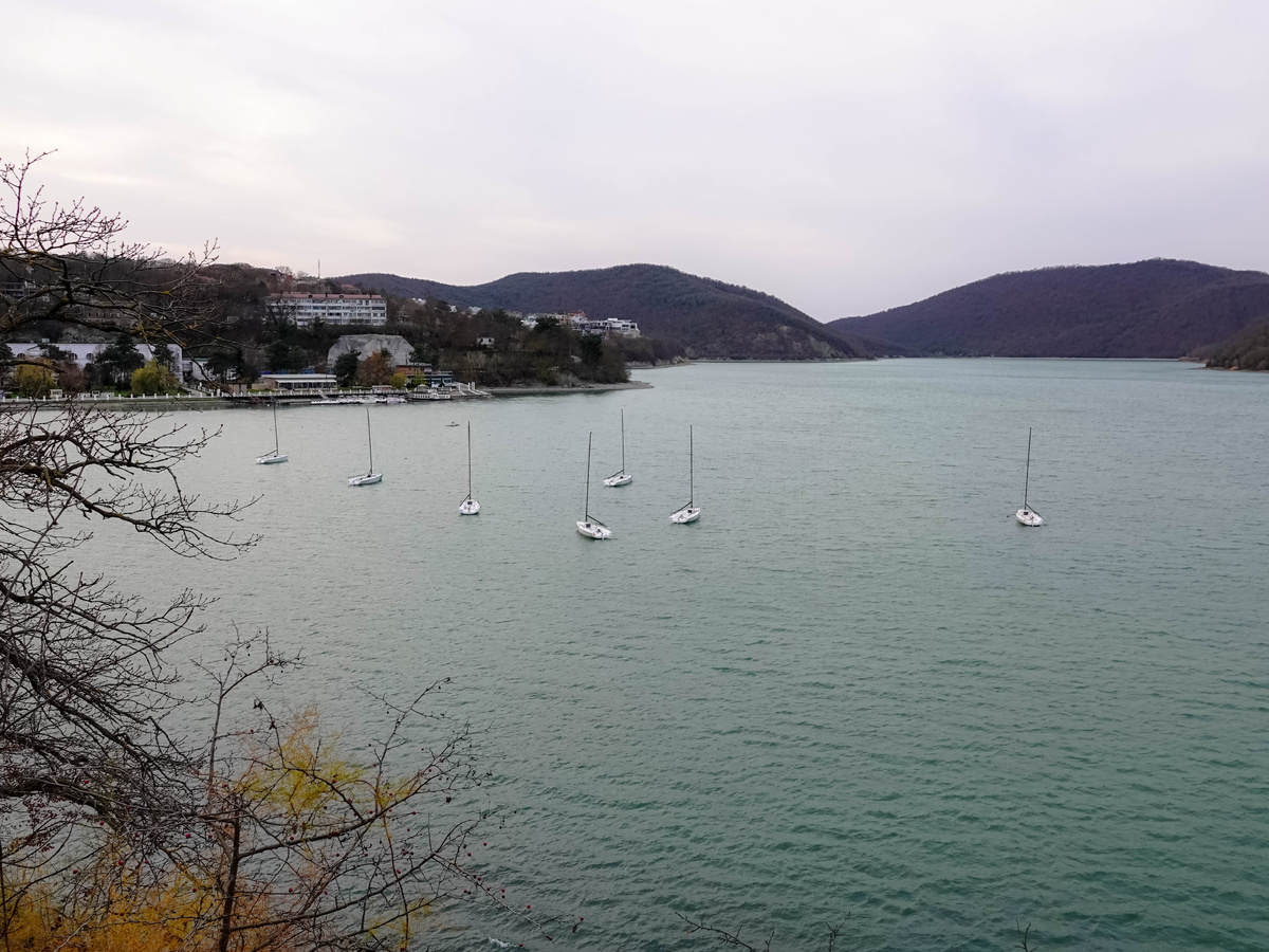 Поздняя осень в Абрау-Дюрсо. Тишину у озера нарушают только утки, которые громко крякают и плещутся у берега.. Вода в озере стального цвета, небо хмуро и пасмурно Местный абраусский лебедь Гоша позировал от души. Птица не пугливая, общительная, разговорчивая. Тихо покрякивает, пофыркивает, ищет еду на дне озера Розы и коты. Лодочки на отдыхе. Утки-кряквы и среди них - широконоска Опустевшие аллеи Красивоплодник Природа в предвкушении зимы