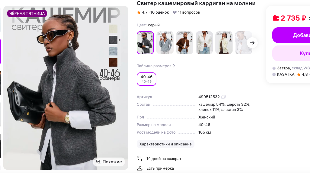 Благородная фактура кашемира в гармонии с шерстью и хлопком — именно та смесь, в которую захочется окунуться, не вылезая до весны. Серый оттенок универсален: с джинсами, с шелковыми платками… всегда будет «то самое чувство». Классика? Безусловно. Но и нотка современности — металлическая молния, которая делает образ чуть динамичнее.