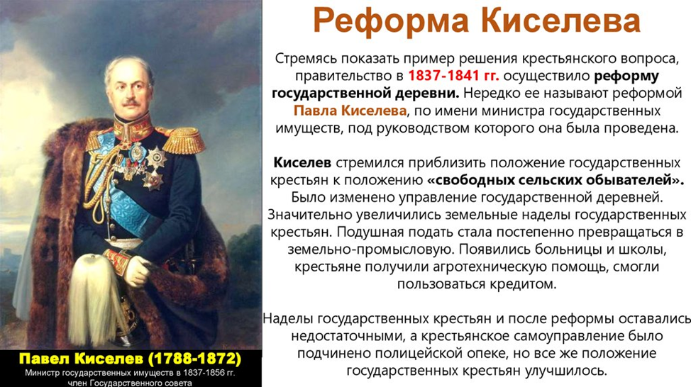 Крестьянский вопрос в России был острым. Николай 1 понимал, что его нужно решать, но понимал он и другое - в стране произошли большие потрясения, а отмена крепостного права может вызвать волну негодования помещиков, что пошатнет позиции самодержавия. Поэтому был избран путь наименьшего сопротивления. Было решено реформировать государственную деревню, чтобы показать пример помещикам. Для реализации реформы был выбран генерал Павел Дмитриевич Киселев, которого Император называл «начальником штаба крестьянской армии».
