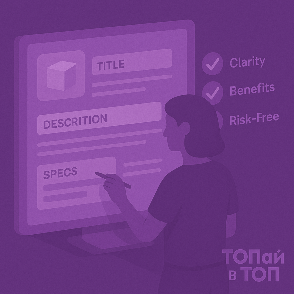 Карточка товара на маркетплейсе — это ваш отдельный лендинг. При конкуренции в сотни тысяч позиций выживают не те, у кого «просто есть товар», а те, у кого карточка грамотно упакована: под покупателя, под поиск и под поведение. Ниже — базовый чек-лист упаковки от сервиса «ТОПай в ТОП», который помогает продавцам WB и Ozon разгонять карточки без лишнего слива бюджета. Перед тем как писать заголовок и лепить фото, ответьте на четыре вещи: кто покупает (возраст, сценарий — домой, в офис, в подарок), зачем покупают (решить боль, заменить старое, попробовать тренд), что для них главное (цена, состав, бренд, отзывы, скорость доставки), насколько они «в теме» товара. Один и тот же рюкзак по-разному упаковывается для студента, офисного сотрудника и покупателя «на подарок». Без этого шага карточка получается «про всё и ни про кого» и тонет в выдаче. Фото — это не «красиво», а «понятно». Базовый набор: Главная ошибка — писать описание только под ключи. Заголовок и текст должны в первую очередь