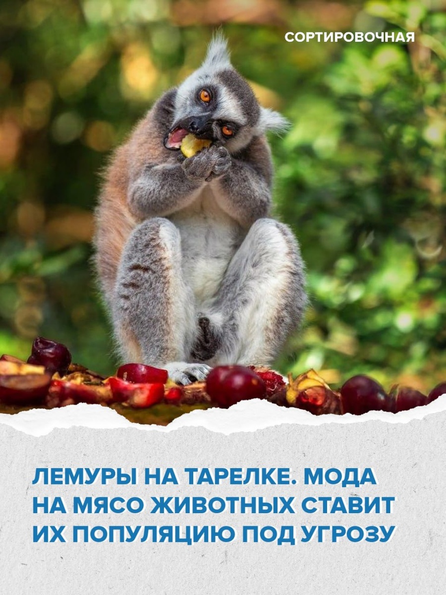 В городах Мадагаскара лемуров убивают ради мяса для обеспеченных жителей Исследователи подсчитали: • ежегодно жертвами рынка становятся около 13 000 лемуров; • 95% сделок проходят тайно, вне контроля властей; • мясо лемуров — дорогой деликатес, в 3 раза дороже говядины. Лемуры — уникальные эндемики Мадагаскара. Сейчас более 90% видов находятся под угрозой исчезновения. Рекомендации учёных: контроль торговли, создание альтернативного дохода для охотников и образовательные кампании о сохранении видов. Подписаться на Сортировочную👍