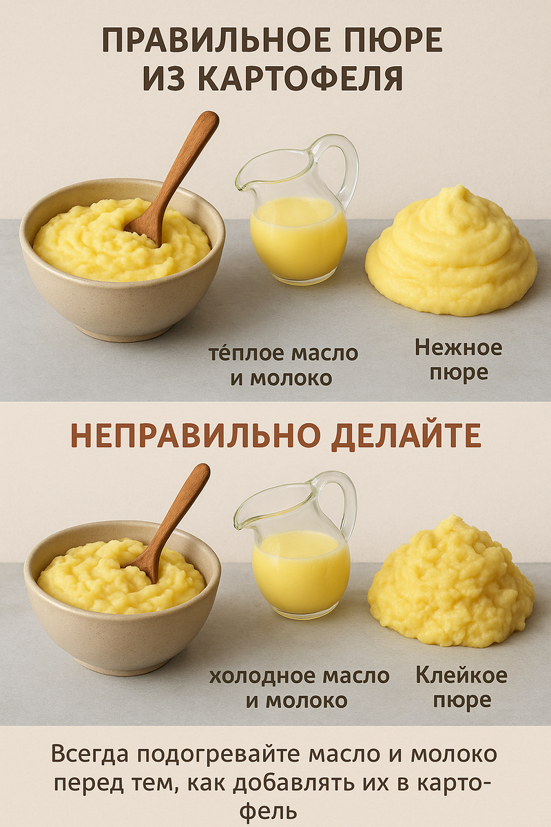 👉 Всегда подогревайте масло и молоко перед тем, как добавлять их в картофель.