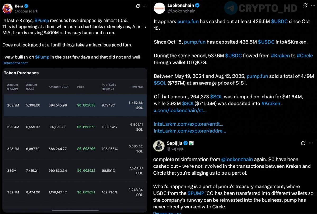 ☠️ #PUMP Сооснователь Pump․Fun исчез? ➠ В Twitter распространяется FUD о потенциальном скаме проекта Pump․Fun. ➠ Ходя #слухи, что сооснователь Pump․Fun (Alon Cohen) исчез/сбежал из США. ➠ Команда проекта молчит уже больше недели – никаких апдейтов или обратного выкупа PUMP. ➠ Доходы Pump․Fun просели почти на 50% за неделю, токен PUMP торгуется на уровне июльских минимумов. ➠ Скандал подогревает недавнее исчезновение $436m из резервов – масштабные переводы USDC на Kraken, а далее в Circle. ➠ Sapijiju (сооснователь Pump․Fun) отрицает информации о переводах миллионов $$$ из резервов, называя это перераспределением USDC, собранных в ходе ICO токена PUMP. ➠ Разъяснение Sapijiju вызвало неоднозначную реакцию. Некоторые указали на противоречие – команда отрицает причастность к транзакциям на Kraken и Circle, но признает, что операции с USDC были частью управления казначейством ICO PUMP. Другие – выдохнули с облегчением, потому что команда проекта подала признаки жизни. Ране: слухи об