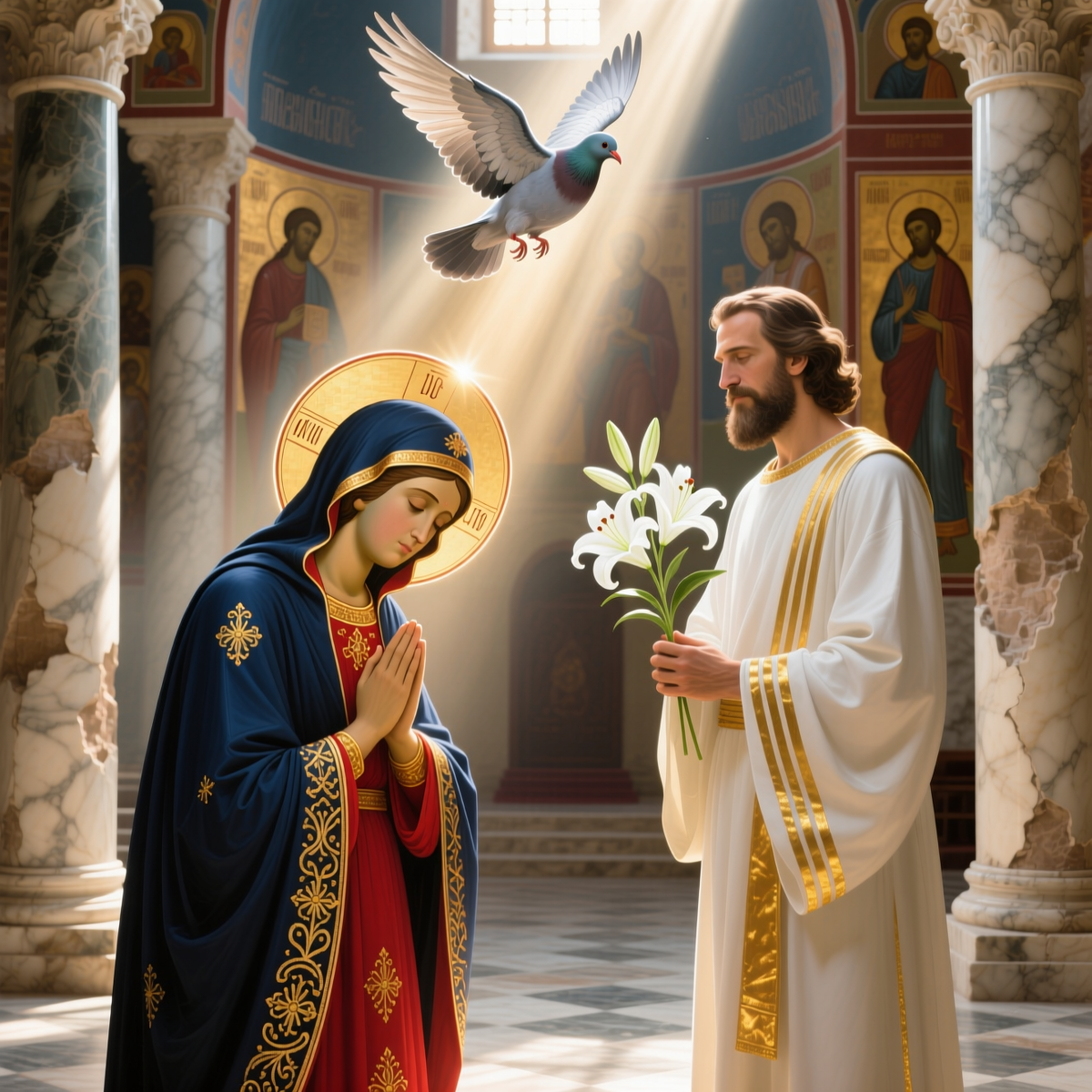 — **Движение и покой**: Гавриил в динамике полета, Мария — в неподвижности молитвы.