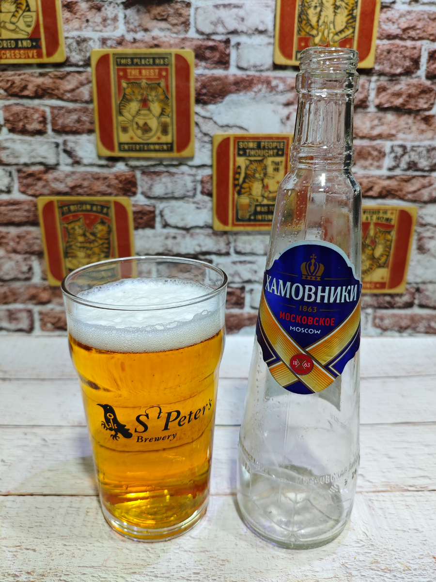 Изготовитель: ЗАО "Московская Пивоваренная Компания", г. Мытищи Московской области. На сайте пивоварни описание следующее: Вдохновленное классикой с мягким солодовым профилем и легкой хлебной ноткой, это пиво дополнено кристальной чистотой и освежающей легкостью, характерной для сортов холодной пастеризации. Идеальный баланс между благородной горчинкой и деликатной сладостью солода делает «Хамовники Московское» универсальным выбором. Вкус, где каждая капля — диалог между прошлым и настоящим. ********************************************************************************** Плотность: 12.6%. Горечь: 15. Состав: вода питьевая, солод пивоваренный ячменный, хмелепродукты. Срок годности: 9 месяцев с хранением при температуре от 2℃ до +25℃. С даты розлива моей бутылки прошло чуть менее 3-х месяцев. ********************************************************************************** Пена присутствует; стойкость средняя и вскоре от неё осталась лишь тонкая плёнка на поверхности и краям бокала.