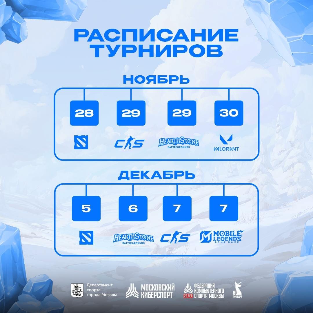 Возможно, это последние турниры в этом году — не пропусти свою возможность сыграть! Выбирай дисциплину и вступай в бой: 🌀 Dota 2 28 ноября — ссылка 5 декабря — ссылка 🌀 Counter-Strike 2 29 ноября — ссылка 7 декабря — ссылка 🌀 HSBG 29 ноября — ссылка 6 декабря — ссылка 🌀 VALORANT 30 ноября — ссылка 🌀 MLBB 7 декабря — ссылка Увидимся на полях сражений!
