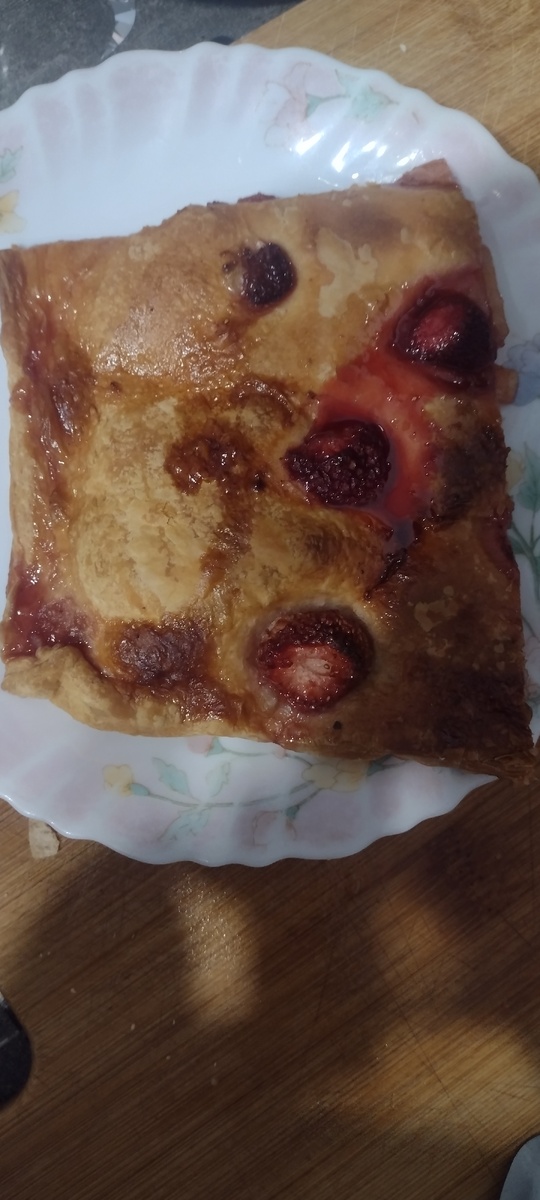 Захотелось чего-то сладенького,с фруктами и ягодами,из ягод в магазине купила мороженную клубнику ,а из фруктов были груши и яблоки ,ещё в морозилке лежало дрожжевое слоенное тесто.Фрукты нарезала пластинками,клубнику разморозила засыпала сахаром ,отжала сок.Раскатав тесто на два пласта,выложив на пергамент затем разогрев духовку 180градусов, фрукты выложила в хооотичном порядке,посыпав сахаром сверху разложив клубнику.Вторым раскатаным пластом теста все накрыла завернув края теста...сверху полить соком от клубники и ягодками все это запекаем в духовке.