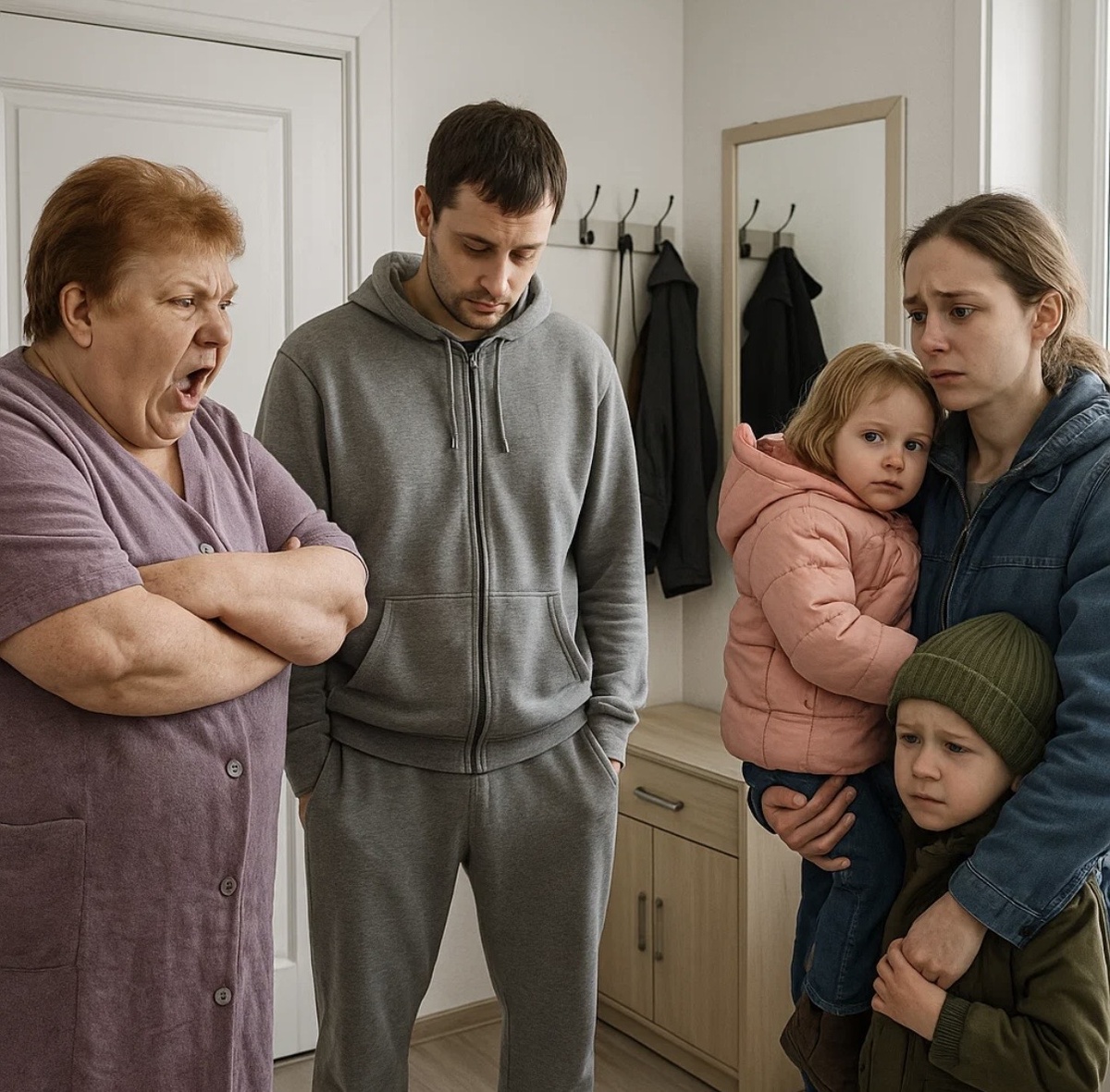 — Я же говорила тебе, сынок, — протянула она сладко. — Эта девка никуда не годится. Ни готовить толком не умеет, ни за собой следить. Посмотри на неё — затрапезная какая! И дети от неё такие же — хныкают постоянно, спать мешают.