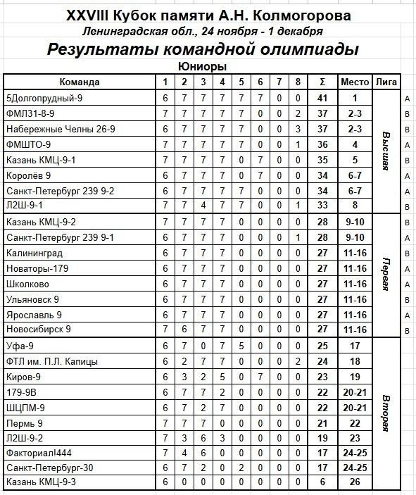 Результаты командной олимпиады XXVIII Кубка памяти А.Н. Колмогорова.