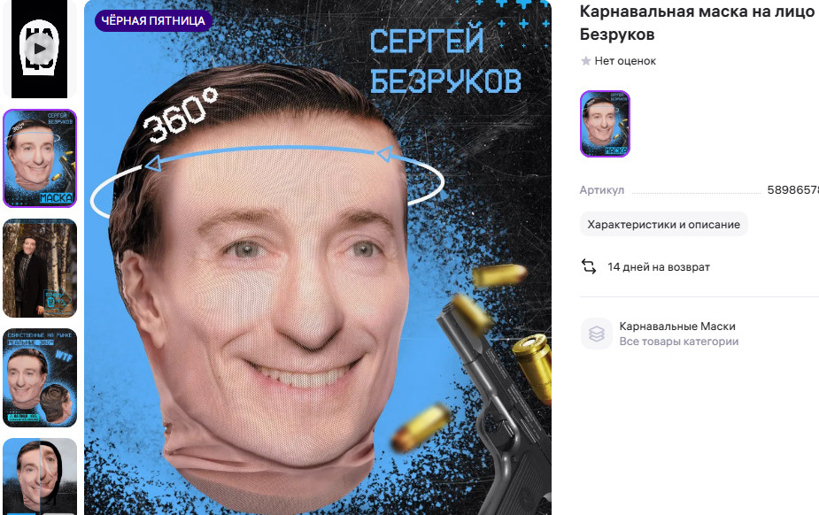 24 ноября стало известно, что Сергей Безруков обратился в Хамовнический районный суд столицы с иском к предпринимательнице Кристине Соболевской. Причиной обращения стало размещение на маркетплейсах новогодних и тканевых масок, изображающих лицо актёра. Общий Телеграм-канал московских судов сообщил: «Ответчик без согласия истца использует его персональные данные: имя, фамилию, изображение, поэтому Сергей Безруков просит суд запретить индивидуальному предпринимателю Кристине Соболевской распространять его персональные данные в сети «Интернет», а также взыскать с ответчика компенсацию морального вреда». По информации РИА новости, Соболевская утверждает, что никаких масок с изображением актёра в ассортименте её магазина нет и уведомлений из суда она не получала: «Суд пока не дает ничего читать. Досудебных претензий не было. Вообще не знаю, о чём речь и почему ко мне...» Предпринимательница считает, что, возможно, такой товар распространяют мошенники. 21 ноября в своём Телеграм-канале Серге