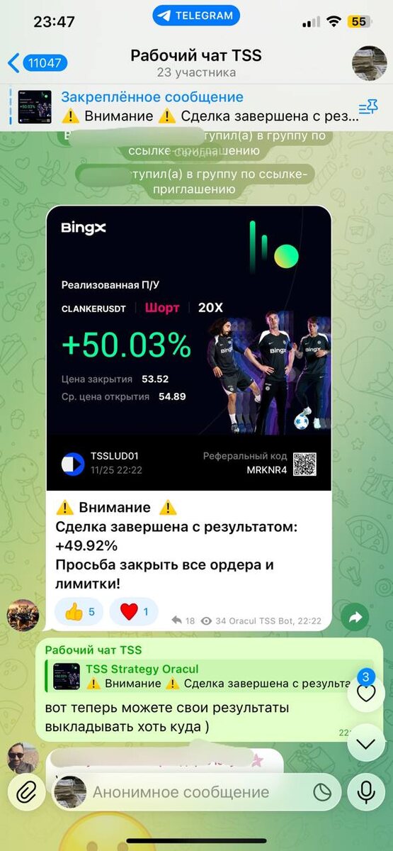 #результаты #tssoracul Сегодня все снова отлично поработали и провели удачную сделку по алгоритму TSS +50% Всех кто принял участие с профитом 😎✅✌🏼 Результаты прикрепляю😎 Бонусы от BingX 👈