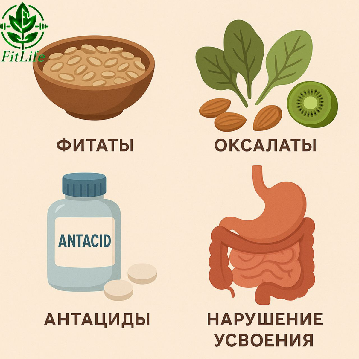 Цинк — важнейший микроэлемент, необходимый для множества функций в нашем организме: от иммунной системы до здоровья кожи и волос. Однако, несмотря на его значимость, дефицит цинка встречается довольно часто. Что же может быть причиной этого? 🤷♂️ Фитаты — это соединения, содержащиеся в растительных продуктах, таких как крупы, отруби и цельные злаки. Они связывают цинк и другие минералы в пищеварительном тракте, препятствуя их усвоению. Это не значит, что нужно полностью отказываться от этих продуктов, но важно помнить о их потенциальном влиянии. Похожим образом действуют оксалаты, которые присутствуют в шпинате, миндале и киви. Эти вещества также могут образовывать нерастворимые комплексы с цинком, снижая его биодоступность. Препараты, известные как антациды, снижают кислотность желудочного сока и могут способствовать дефициту цинка. Кислая среда желудка играет важную роль в усвоении минералов. При регулярном приеме антацидов усвоение цинка может быть нарушено. Проблемы с усвоением ци