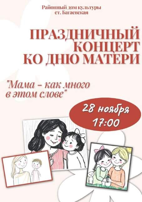 28 ноября в 17:00 Районный Дом культуры распахнет свои двери для зрителей любых возрастов. День матери в России пройдёт 30 ноября, в последнее воскресенье месяца. Праздник, посвящённый самым близким людям, ежегодно меняет дату, но его значение не меняется. В 2024 году его отмечали 24 ноября, в 2026 ожидается 29 ноября. Почитание матерей уходит корнями в древность. В Греции весной отмечали день богини Реи, в Риме — Кибеле. В средневековой Англии существовало Материнское воскресенье. В России День матери появился в 1998 году по указу Бориса Ельцина, благодаря инициативе Алевтины Апариной. Цель — укрепление семейных ценностей и выражение благодарности матерям. В День матери принято дарить подарки, освобождать маму от домашних забот, устраивать семейные ужины и мероприятия в школах и детских садах. Символ праздника — голубая незабудка, символизирующая память и любовь. С 2011 года проходит акция «Мама, я тебя люблю!» с раздачей открыток с незабудкой. На государственном уровне награждают мно