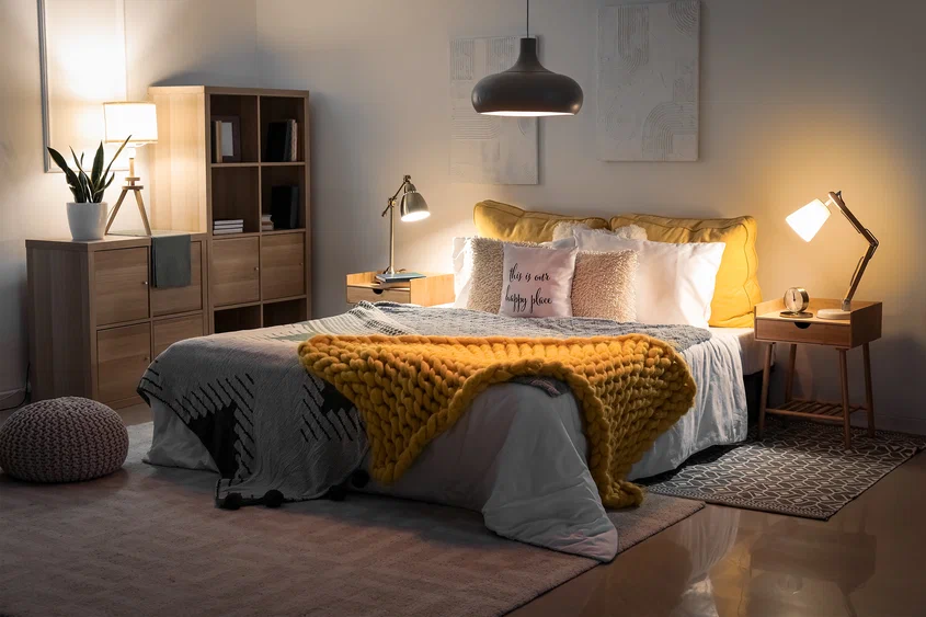 Комбинируйте разные текстуры: гладкий хлопок + шерсть с выпуклой структурой, лён + тонкая шерсть. Контраст поверхностей создаёт сложный, многослойный интерьер. - Обратите внимание на свет