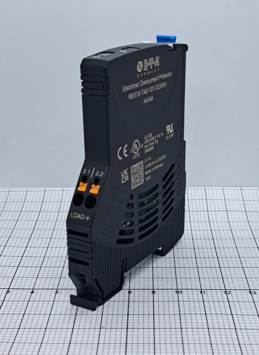 Электронный автоматический выключатель REX12-TA2-107-DC24V-4A/4A от E-T-A - это электронное реле защиты (Electronic Circuit Protector) из серии REX12 компании E-T-A (немецкий производитель систем безопасности и защиты электрооборудования). Это устройство представляет собой компактный автоматический выключатель, предназначенный для защиты электрических цепей от перегрузок, коротких замыканий и других неисправностей. Модель TA2 указывает на двухканальную конструкцию (два независимых канала защиты), с функцией автоматического сброса после устранения неисправности. Оно широко используется в системах, где требуется надежная защита без постоянного вмешательства оператора. Основные характеристики 1. Напряжение питания: 24 В DC (постоянный ток). 2. Номинальный ток: 4 А на каждый канал. 3. Функции защиты: - Защита от короткого замыкания (short-circuit protection); - Защита от перегрузки (overload protection) с регулируемым порогом; - Автоматический сброс после охлаждения (thermal auto-reset).