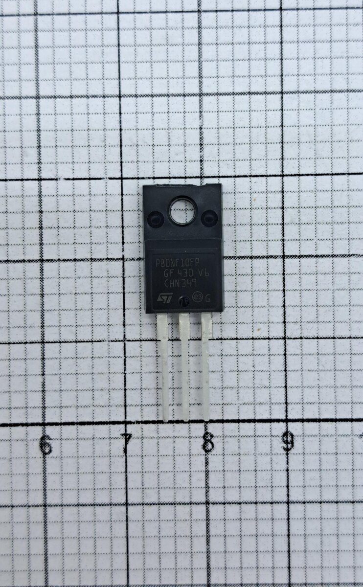 Транзистор STP80NF10FP от ST Microelectronics - это N-канальный транзистор с изолированным затвором (MOSFET) из серии STripFET, компании STMicroelectronics. Он предназначен для высокотоковых и высоковольтных приложений, где требуется эффективное переключение. Модель относится к категории мощных MOSFET с низким сопротивлением в открытом состоянии, упакованных в корпус TO-220FP (Full-Pack) для лучшего отвода тепла. Основные характеристики 1. Тип: N-канальный MOSFET. 2. Напряжение сток-исток (Vds): 100 В (максимальное). 3. Ток стока (Id): 40 А. 4. Сопротивление в открытом состоянии (Rds(on)): 15мОм. 5. Напряжение затвор-исток (Vgs): ŷ20 В (максимальное). 6. Максимальная Рабочая Температура: 175C. Применение Источники питания и инверторы: В DC-DC конвертерах, зарядных устройствах и UPS для эффективного управления током; Моторные драйверы: В системах управления электромоторами (например, в бытовой технике, робототехнике и электромобилях); Автомобильная электроника: В системах зажигания, уп