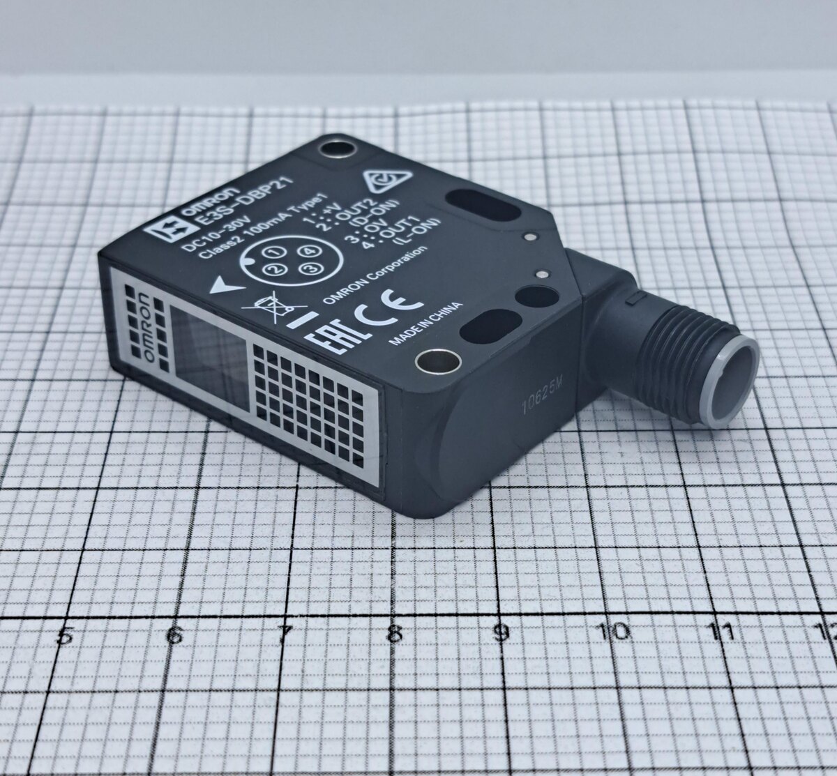 Датчик оптоэлектронный E3S-DBP21 от Omron - это фотоэлектрический датчик, предназначенный для бесконтактного обнаружения объектов в промышленных и автоматизированных системах. Omron - японская компания, лидер в области автоматизации и сенсорных технологий. Основные характеристики датчика: 1. Тип устройства: Фотоэлектрический датчик (photoelectric sensor), диффузного отражения (diffuse reflective type), с PNP-выходом. 2. Принцип работы: Датчик излучает инфракрасный свет и обнаруживает отраженный свет от объекта. Срабатывает при приближении объекта в зону обнаружения, разрывая или замыкая цепь. 3. Корпус: Прочный пластиковый корпус с металлическими элементами, устойчивый к вибрациям и ударам. 4. Оптика: Линза для фокусировки излучения, с возможностью регулировки чувствительности. 5. Напряжение питания: 10-30 В DC (широкий диапазон для промышленного применения). 6. Выход: PNP (открытый коллектор), с возможностью подключения к PLC или реле. 7. Ток нагрузки: До 100 мА. 8. Дальность - от 0