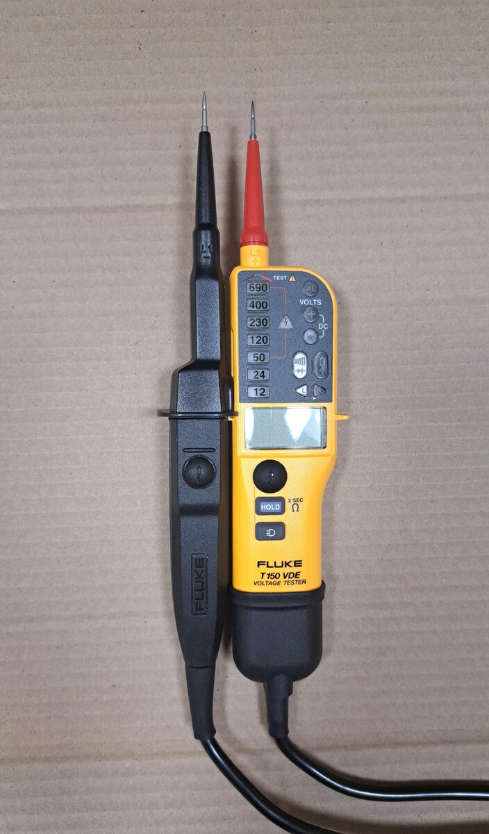 Электрический тестер FLUKE T150/VDE - это компактный и надежный цифровой мультиметр (цифровой тестер), предназначенный для профессионального использования в области электромонтажа, технического обслуживания и диагностики электрических систем. Производитель Fluke Corporation - известный мировой лидер в производстве измерительного оборудования высокого качества. Основные характеристики тестера 1. Назначение: Измерение основных электрических параметров - напряжения, тока, сопротивления, проверка целостности цепи, диодов и др. 2. Диапазоны измерений: - Напряжение переменного и постоянного тока (AC/DC) - до 690В; - Сопротивление - от 1 до 1999Ом. 3. Экран: Цифровой ЖК-дисплей с подсветкой, удобен для работы в условиях низкой освещенности. 4. Безопасность: Соответствует стандартам безопасности IEC/EN61010 и VDE для работы в электросетях до 600 В CAT III. 5. Питание: От стандартных батареек (обычно 2AAA) Особенности: Прочный корпус с защитой от ударов и падений; Автоматический выбор диапазон