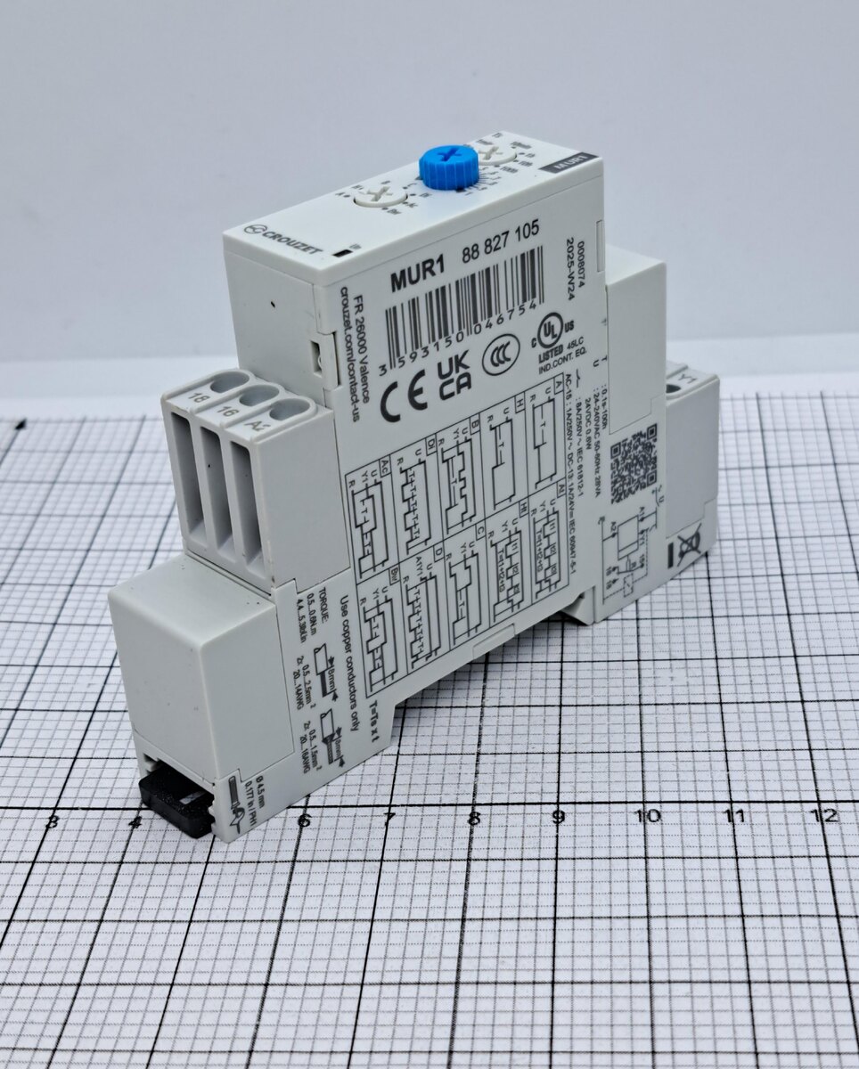 Аналоговый таймер 88827105 от Crouzet Automation - это компактный аналоговый таймер (analog timer) от французского производителя Crouzet Automation (специализируется на реле, таймерах и системах автоматизации). Эта модель предназначена для простого и надежного управления временными задержками в электрических цепях. Основные характеристики 1. Тип: Аналоговый таймер с механической настройкой (ручка для установки времени). Функция: задержка выключения (таймер запускается при подаче питания, а контакт размыкается после заданной задержки). 2. Временной диапазон: 0,1с - 100ч. 3. Электрические параметры: Напряжение питания 24 V AC/DC (автоматическое распознавание). Выход: 1 переключающий контакт (SPDT - 1 NO + 1 NC), максимальный ток нагрузки 8 A при 250 V AC (резистивная нагрузка). 4. Монтаж на DIN-рейку. Корпус из термопласта с классом защиты IP20 (для сухих помещений). 5. Рабочие условия: Температурный диапазон от -20C до +60C. Устойчивость к вибрациям . Применение - Промышленная автомати