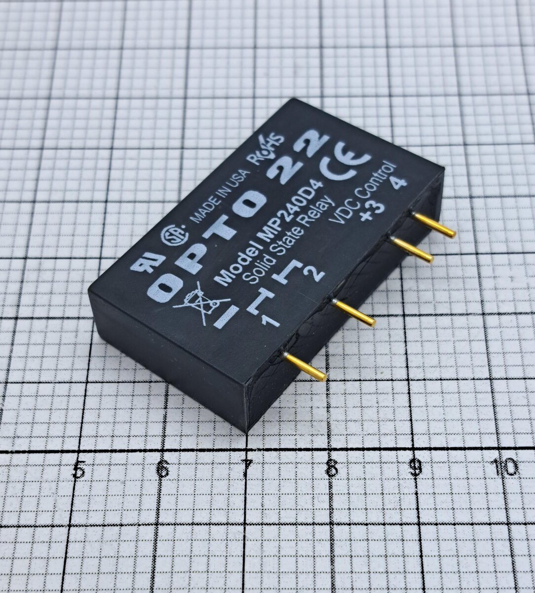 Твердотельное реле MP240D4 от OPTO 22 - это компактный и надёжный компонент для бесконтактной коммутации электрических цепей, идеальный для автоматизации и управления нагрузками.Opto 22 - американский производитель промышленной электроники, известный своими твердотельными реле (SSR) и контроллерами, и эта модель входит в популярную серию MP. Основные характеристики 1. Модель: MP240D4. Часть серии MP (Miniature Power), которая включает миниатюрные SSR для различных нагрузок. 2. Тип: Однофазное твердотельное реле, нормально разомкнутое (NO), для коммутации переменного тока (AC). Входной сигнал - постоянный ток (DC), что позволяет управлять им от микроконтроллеров или PLC. 3. Электрические параметры: - Номинальный ток: 4 А; - Напряжение нагрузки: до 280 В AC; - Изоляция: Оптоизоляция между входом и выходом, что защищает управляющую электронику. 4. Материалы: Корпус из термостойкого пластика, контакты на основе кремния. Устойчив к вибрациям, ударам и перегреву. 5. Дополнительные особеннос
