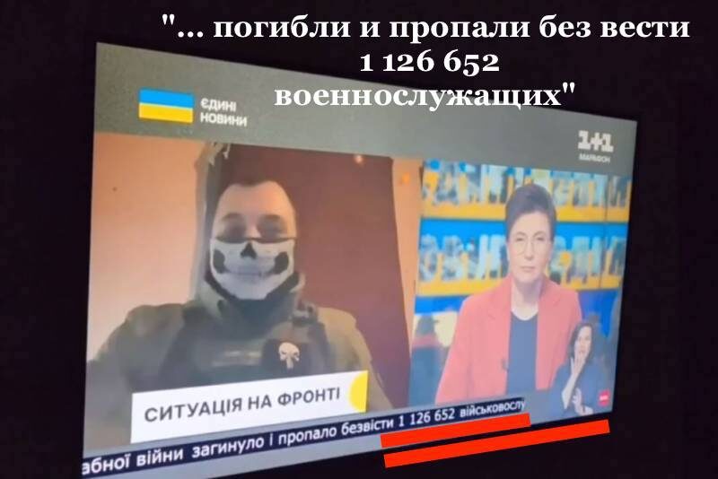 - Украинский телеканал "1+1" в прямом эфире представил данные о потерях ВСУ в живой силе с начала российской СВО, при этом зрителям было показано очень большое число потерь. Запись новостного эфира распространил телеграм-канал "Военный обозреватель". Согласно представленному ролику, в бегущей строке телеканала со ссылкой на министерство обороны говорилось, что с начала боевых действий "погибли или пропали без вести 1126652 военнослужащих".