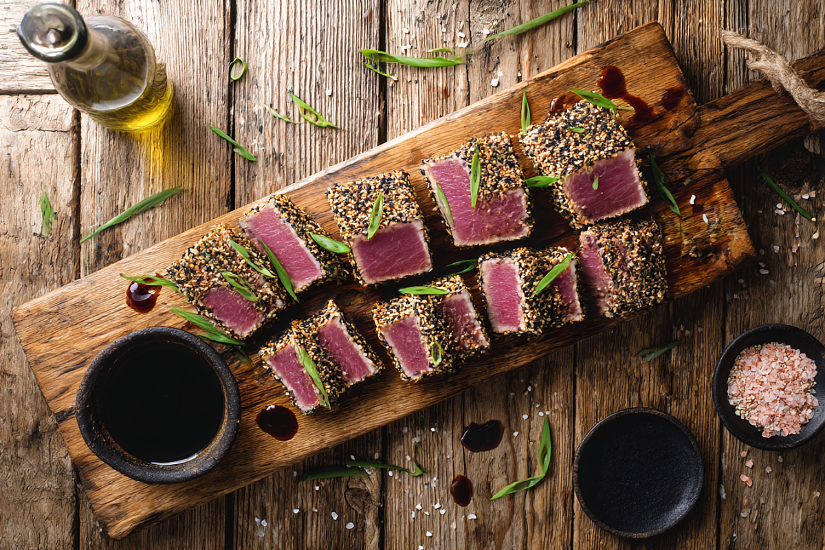 Такой тунец хорош и как тёплая закуска, и как лёгкий ужин. Готовится он буквально на глазах: пока разогревается сковорода, можно спокойно довести рыбу до комнатной температуры, смешать кунжут, перец и соль. Главное здесь — не пересушить стейк, оставить сердцевину прохладной и розовой, тогда вкус получается очень деликатным, а структура — мягкой и сочной. Пошаговый рецепт Шаг 1. Подготовьте тунец. Свежемороженый стейк тунца полностью разморозьте и дайте ему полежать при комнатной температуре, чтобы он прогрелся внутри. Это важно, чтобы рыба прожарилась ровно и не была ледяной в центре. Шаг 2. Разогрейте сковороду. Поставьте сковороду-гриль на огонь, налейте немного растительного масла и хорошо прогрейте поверхность. Масло должно лишь слегка покрывать дно, а не плавать лужей. Шаг 3. Приготовьте смесь для панировки. В тарелку высыпьте кунжут, добавьте чёрный перец и розовую соль, слегка перемешайте. Это будет ароматная смесь для одной стороны стейка. Шаг 4. Обваляйте тунец. Возьмите стейк