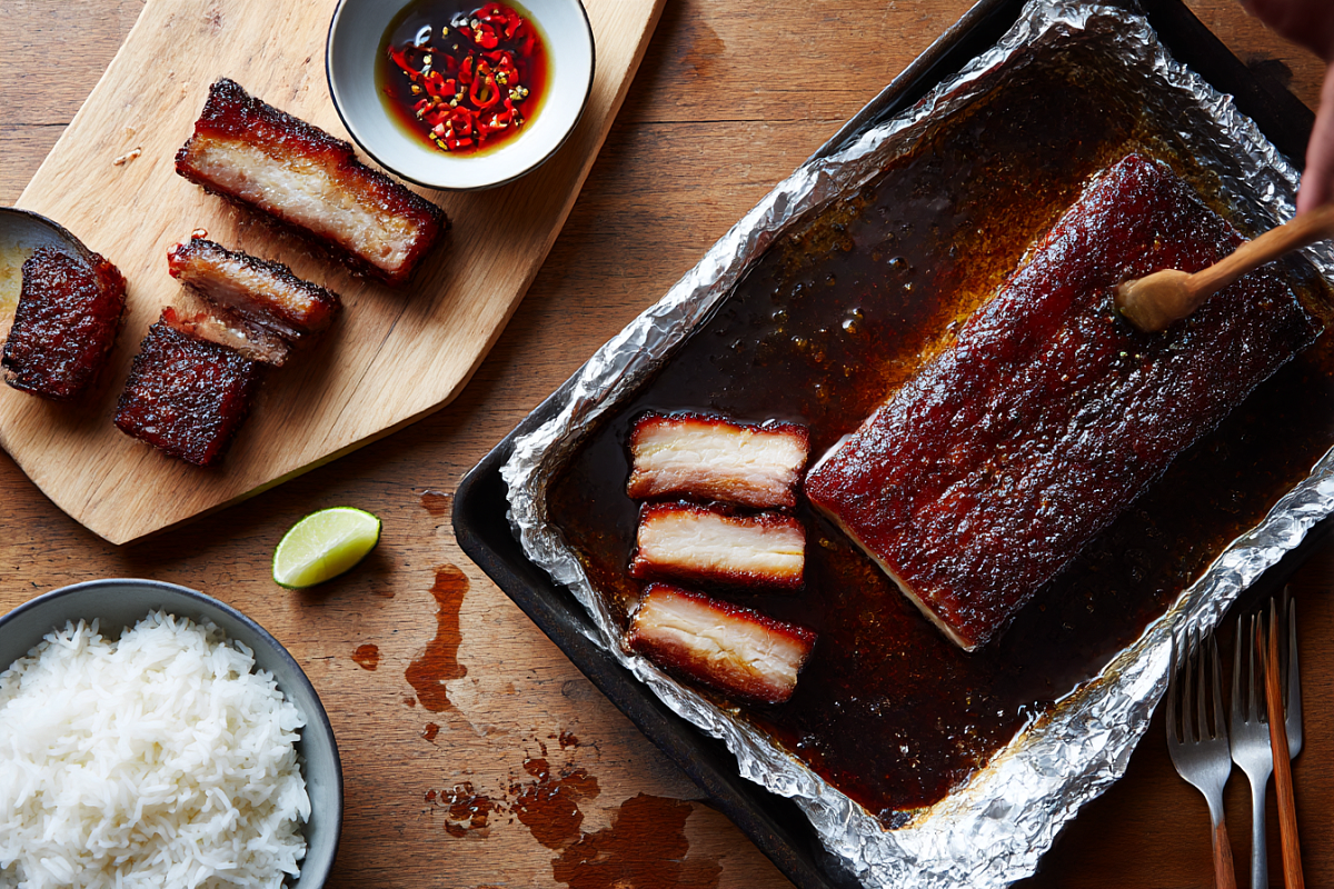 Этот вариант свиной грудинки в соевом маринаде из «золотых» рецептов. Здесь всё честно: доступные продукты, понятные действия и при этом результат уровня хорошего азиатского ресторана. Мясо остаётся нежным, корочка румяной, а соус из сока после запекания так хорош, что им хочется полить весь гарнир. Пошаговый рецепт Шаг 1. Подготовьте грудинку. Если кусок с костями, аккуратно срежьте их острым ножом, стараясь оставить побольше мяса. Кости и хрящи не выбрасывайте, они пригодятся для горохового супа или насыщенного бульона. Саму грудинку подровняйте, чтобы по толщине кусок был более-менее равномерным. Шаг 2. Сварите маринад. Возьмите 1 чашку соевого соуса (примерно 300 мл), 1 чашку воды, полчашки нарезанного имбиря, столько же раздавленного чеснока, пару стручков острого перца, добавьте 1–2 столовые ложки устричного соуса, 2 лавровых листа, 1 стакан сока или белого вина и столовую ложку сахара. Доведите до кипения и томите на тихом огне не меньше 30 минут, чтобы специи отдали вкус. Если