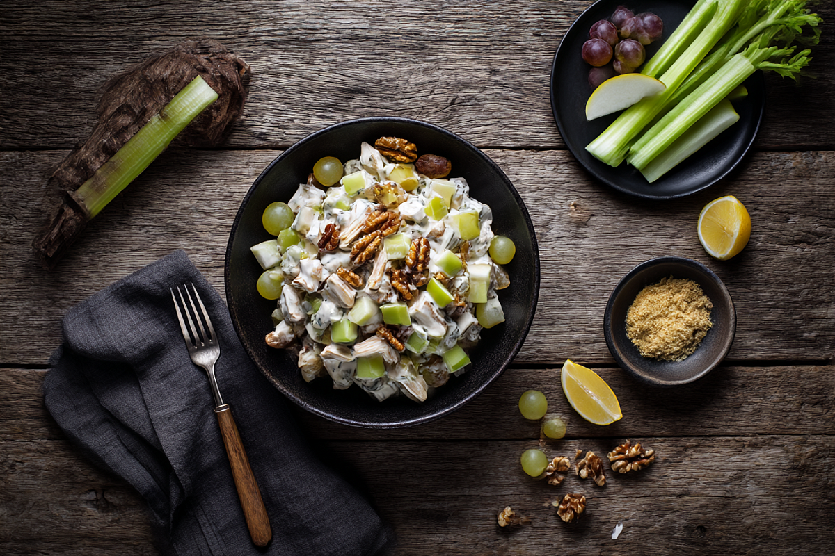 Перед Новым годом мы все начинаем собирать рецепты. В советское время это салат был известен по именем «витаминный». На деле это упрощённая версия американского салата Вальдорф, а настоящий вариант куда интереснее: больше текстур, больше вкуса и совсем другое настроение на тарелке. Яблоки и виноград Для начала приготовьте простой сахарный сироп, чтобы яблоки не окислялись. В примерно 500 миллилитров фильтрованной воды растворите 30–40 граммов сахара, сироп должен быть чуть сладким. Яблоко без косточек нарежьте острым ножом кубиком и сразу переложите в этот сироп. Так дольки сохраняют цвет и не темнеют, пока вы занимаетесь остальными ингредиентами. Безкосточковый виноград типа кишмиш нарежьте небольшими кусочками. Важно, чтобы внутри не было косточек, иначе салат получится неудобным в еде. При желании виноград можно кратко замариновать: немного лимонного сока, щепотка сахара и соли — ягоды станут ярче по вкусу. Шампиньоны и сельдерей Мелкие шампиньоны разрежьте пополам. Сковороду с неб