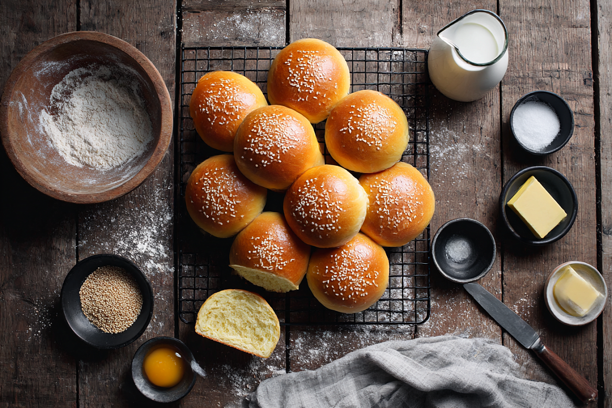 Лето, свежий воздух, мангал или гриль во дворе — так и тянет собрать родных, пожарить котлеты и собрать большие сочные бургеры. И очень быстро понимаешь, что без хорошей булочки не получится «того самого» вкуса: либо она слишком сладкая, либо разваливается, либо жуется, как резина. Дрожжевое тесто, которое любят руки, решает эту задачу. Здесь не нужно ничего придумывать: тёплое молоко, простые продукты, немного терпения на замес и расстойку — и на противне уже стоят аккуратные румяные «колобки». Они получаются нежными, пружинистыми, не крошатся, легко разрезаются пополам и отлично держат начинку. Пошаговый рецепт булочек для бургеров Шаг 1. Подготовьте дрожжи. Молоко слегка подогрейте до тёплого состояния. Всыпьте в него часть сахара и сухие дрожжи, хорошо перемешайте, накройте и оставьте примерно на 10 минут, пока дрожжи не «проснутся» и не начнут пениться. Шаг 2. Смешайте сухие ингредиенты. В большой чаше соедините пшеничную муку, оставшийся сахар и соль, перемешайте и сделайте в цен