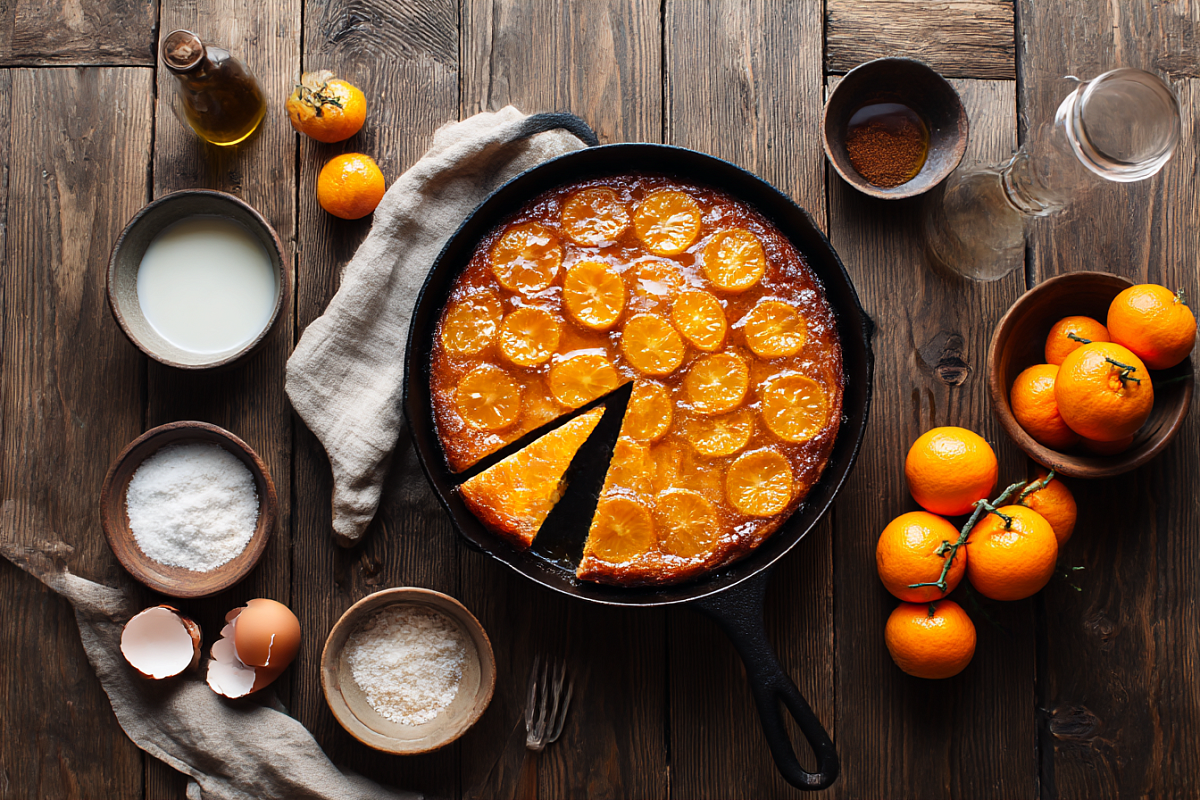 До этого дня мандарины у меня были сырыми и в салатах. Жарить их даже в голову не приходило. Но стоит разрезать сладкие дольки пополам, уложить в тёплую карамель с корицей, закрыть всё нежным йогуртовым тестом — и получается блюдо, которое хочется готовить снова и снова. У этого пирога простой характер: минимум продуктов, одна сковорода и никаких сложных приёмов. Сладкая мандариновая корочка, мягкая цитрусовая серединка, сверху — нежное тесто. Подать его лучше всего с лимонадом из дикой вишни: лёгкая кислинка напитка подчёркивает аромат мандаринов и делает десерт по-настоящему особенным. Пошаговый рецепт пирога с жареными мандаринами Шаг 1. Подготовьте мандарины. Вымойте их, обсушите и разрежьте пополам. Сразу сложите половинки в отдельную миску, чтобы потом быстро переложить их на сковороду. Шаг 2. Сделайте основу для теста. В миске взбейте яйцо с сахаром и щепоткой соли до однородности. Добавьте йогурт, масло, затем всыпьте муку с разрыхлителем и хорошо перемешайте. Должно получиться