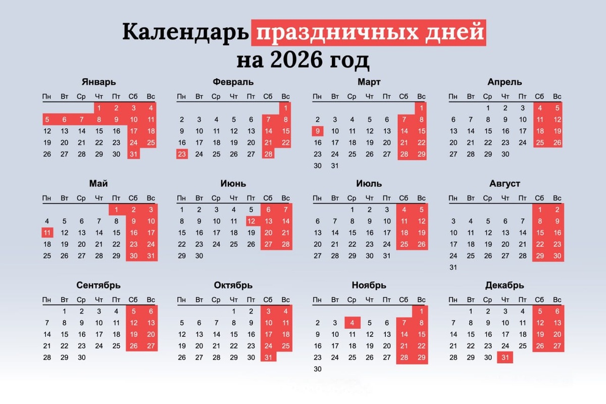 В 2026 году россиянам не придётся работать по субботам: нас ждёт 7 сокращённых рабочих недель и отсутствие шестидневных Производственный календарь на 2026 год предусматривает семь сокращенных рабочих недель для россиян. Так, выходные дни будут предоставлены в связи с Днем защитника Отечества (21-23 февраля), а также в марте (10-13), апреле (27-30), мае (12-15) и июне (8-11). Дополнительные выходные приходятся на 4 ноября и 31 декабря, что приведет к разделению рабочей недели в ноябре на четыре дня и сокращению последней рабочей недели декабря до трех дней. При стандартной пятидневной рабочей неделе в 2026 году будет 118 дней отдыха (включая выходные и праздники) и 247 рабочих дней. Новогодние каникулы станут самыми продолжительными за последние годы, продлившись с 31 декабря 2025 года по 11 января 2026 года (12 дней).