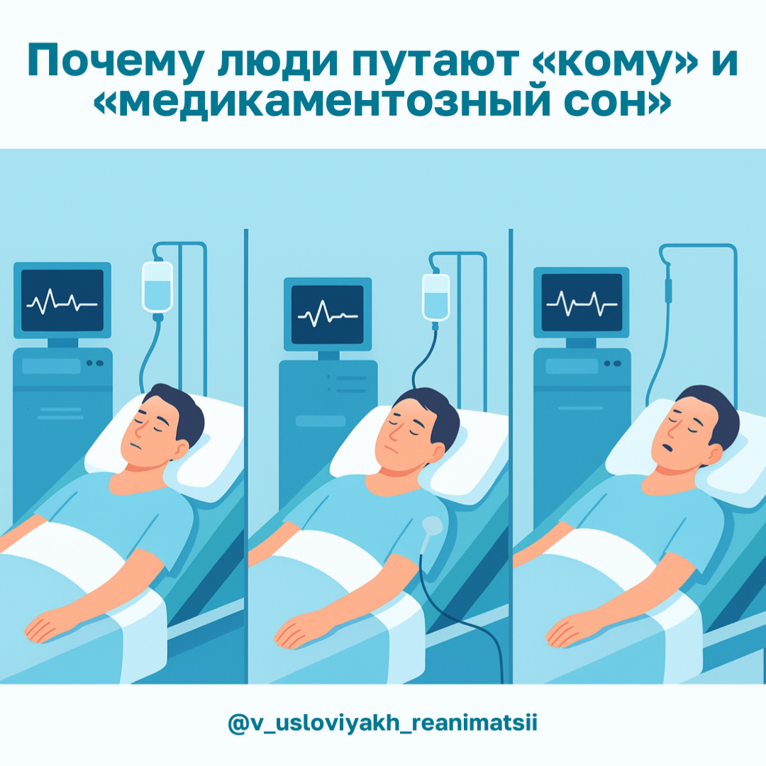 Путаница между понятиями «кома», «медикаментозная кома», «медикаментозный сон» и «седация» встречается крайне часто. Для пациентов и их родственников эти состояния выглядят похожими: отсутствие сознания, аппараты, трубки, мониторы. Термины звучат похоже, а медиа часто используют их как синонимы. Ниже — подробная статья, объясняющая причины путаницы, клинические различия и рекомендации для врачей по коммуникации. В чём реальная разница Кома — это патологическое состояние, при котором человек не реагирует на внешние стимулы из-за структурного или метаболического повреждения мозга. Причины: травма, инсульт, гипоксия, отёк, тяжёлые нарушения обмена. Медикаментозная кома и медикаментозный сон — это контролируемое врачами состояние глубокой седации, создаваемое препаратами. Цель — снизить активность мозга, защитить его от повреждения, снизить внутричерепное давление, прекратить судорожную активность, обеспечить синхронизацию с ИВЛ. Это обратимое состояние. Седация в реанимации бывает р