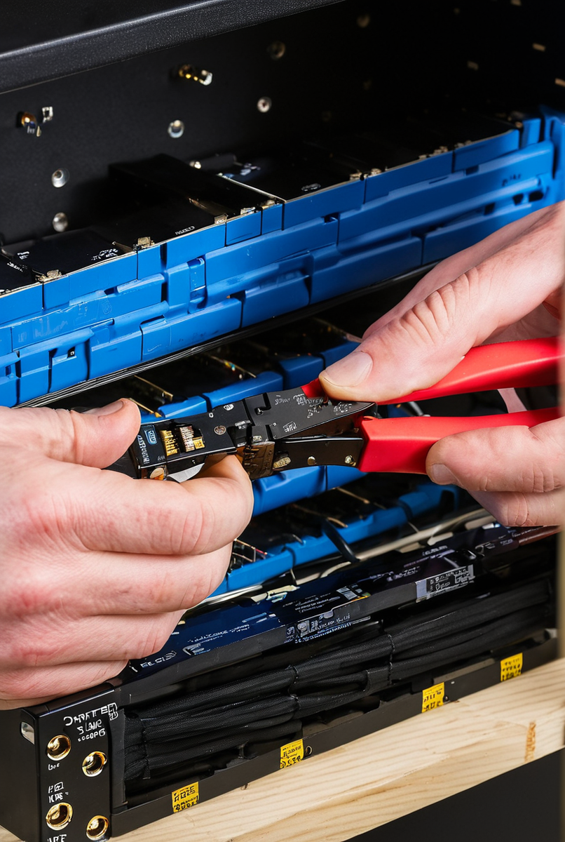 - Обжим. Вставьте коннектор в обжимные клещи и с усилием сожмите рукоятки до щелчка. Ножи инструмента прорежут изоляцию и создадут надежный контакт.