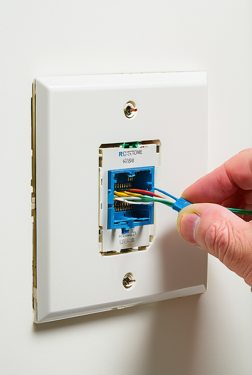 - Подключение к модулю: Установка жил в модуль розетки (например, модуль Keystone) — самый ответственный шаг. Провода раскладываются в пазы в соответствии с цветовой схемой, указанной на самом модуле. Затем, с помощью специального ударного инструмента (punch-down tool), каждая жила продавливается в IDC-контакт. Нож инструмента одновременно прорезает изоляцию и обрезает излишек провода, обеспечивая надежное подключение.