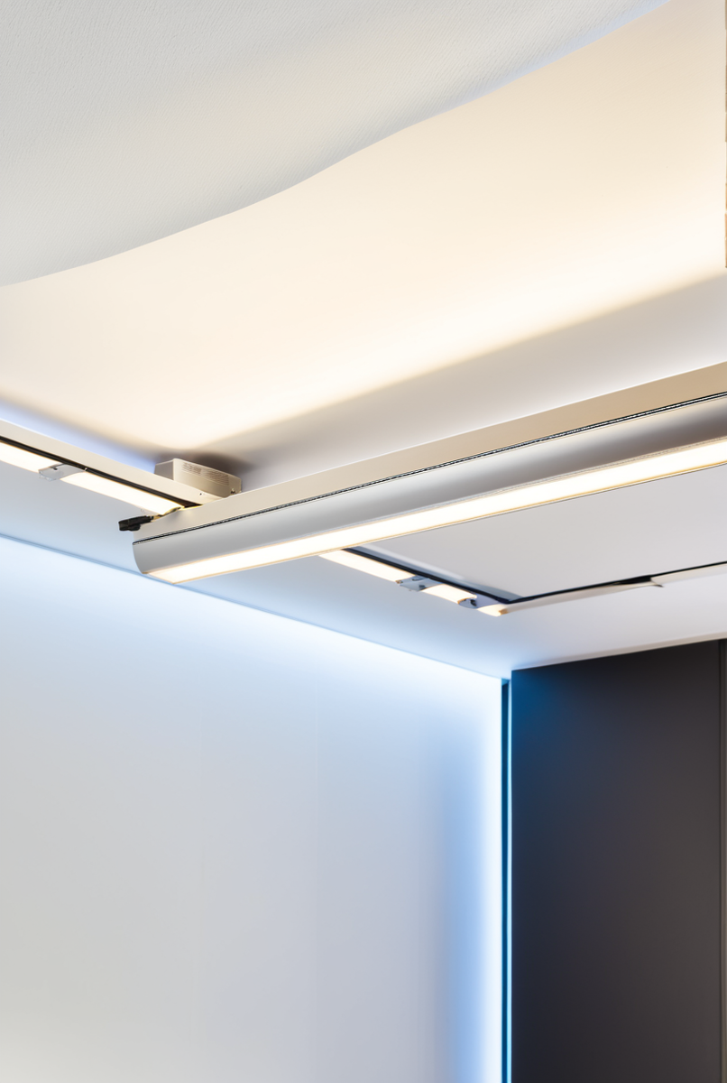Завершающий этап, установка трековых светильников. Это самая гибкая часть работы: трековый светильник легко вставляется в паз шины и фиксируется. Главное преимущество в возможности свободно перемещать и направлять источники света‚ быстро адаптируя светодиодное освещение под любые изменения в интерьере.