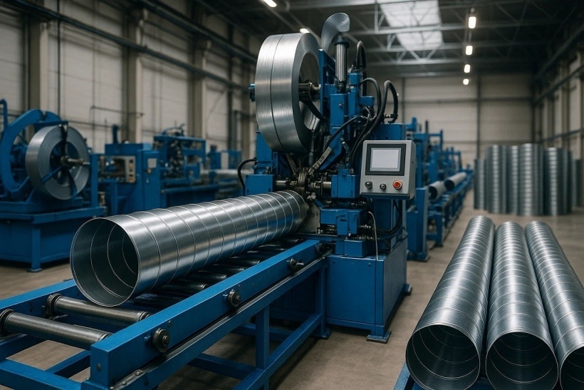 Более прогрессивным решением выступают спирально-навивные станки, позволяющие производить круглые воздуховоды быстро и качественно. Процесс заключается в автоматической навивке металлической ленты на специальный шаблон с последующим формированием замка-шва, обеспечивающего жёсткость и герметичность конструкции.
