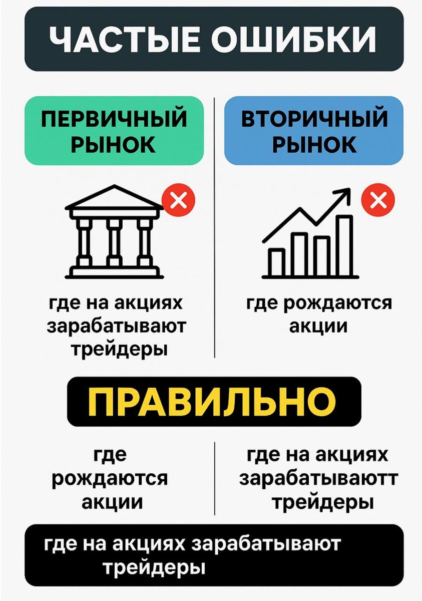 Хотите мгновенно понять, как вообще живёт фондовый рынок? Начнём с двух слов, которые слышали все, но понимают единицы: первичный и вторичный рынок. И вот вам обещаю: через 2 минуты вы будете разбираться в них лучше большинства начинающих трейдеров. 🟢 ПЕРВИЧНЫЙ РЫНОК — момент рождения Представьте, что компания — это завод, которому нужны деньги. Например, строить новые цеха, покупать оборудование или выходить на новые рынки. Что она делает? 👉 Выходит на биржу и впервые продаёт свои акции людям. Это и есть первичный рынок — момент, когда акции появляются «на свет». Это называется IPO — первичное размещение. Или SPO — когда компания выпускает новый пакет акций повторно. В этот момент деньги идут не трейдерам, а компании. Это её способ привлечь капитал. Вывод: На первичке вы покупаете у самой компании. Это как купить квартиру у застройщика на этапе котлована. 🔵 ВТОРИЧНЫЙ РЫНОК — то, где торгуем МЫ Дальше начинается наша жизнь — жизнь трейдеров. После того как акции попали в свободн