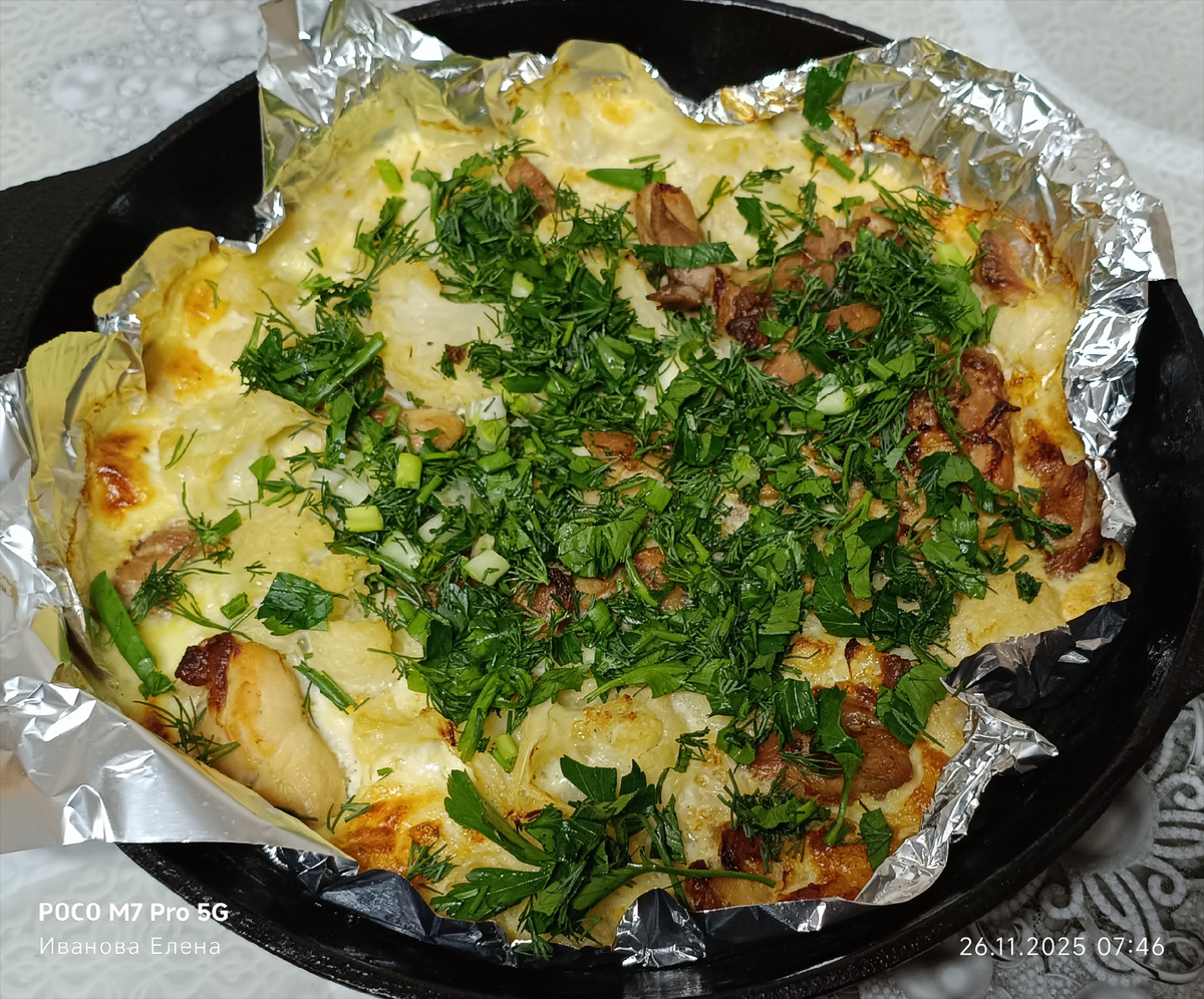 Повседневную еду мало показываю, неаппетитно, неэстетично... Невкусно, у меня невкусно. Что вкусного в цветной капусте? Обжарила филе бедра, смешала с цветной капустой, залила смесью из яиц и молока. После запекания посыпала зеленью.