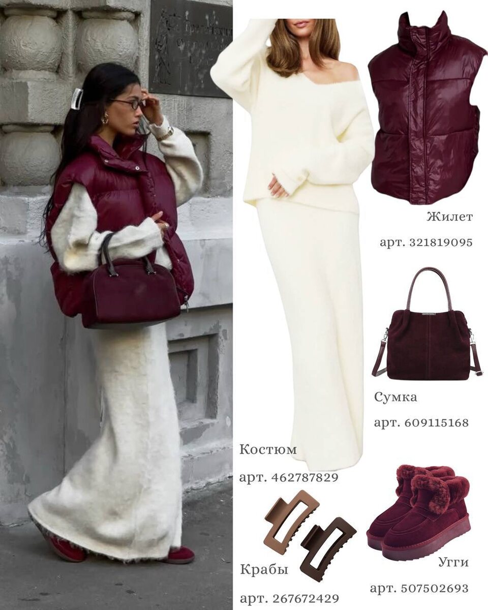 Зима — идеальное время, чтобы позволить себе максимум комфорта, не отказываясь от красоты и продуманности образов. Мягкие фактуры, уютные слои, теплые жилетки, объемные свитеры, шерстяные брюки и пушистые уги — все это создаёт то самое настроение: когда ты выходишь из дома и знаешь, что тебе тепло, удобно и при этом ты выглядишь гармонично. Сегодня собрала 6 готовых образов с WB, которые не требуют долгих раздумий — просто выбирай и носи с удовольствием. Перейти прямо к данному посту в Telegram с активными ссылками на вещи Образ с теплым молочным платьем и объемной бордовой жилеткой — пример того, как уют может выглядеть благородно. Мягкая фактура платья, пушистые уги и варежки создают ощущение полного тепла, а бордовые акценты делают образ более глубоким и выразительным. Образ хорош и для прогулок, и для неспешных выходных в городе. Совет: добавляй аксессуары тон в тон — бордовая сумка или краб-невидимка завершат образ. Перейти прямо к данному посту в Telegram с активными ссылками на