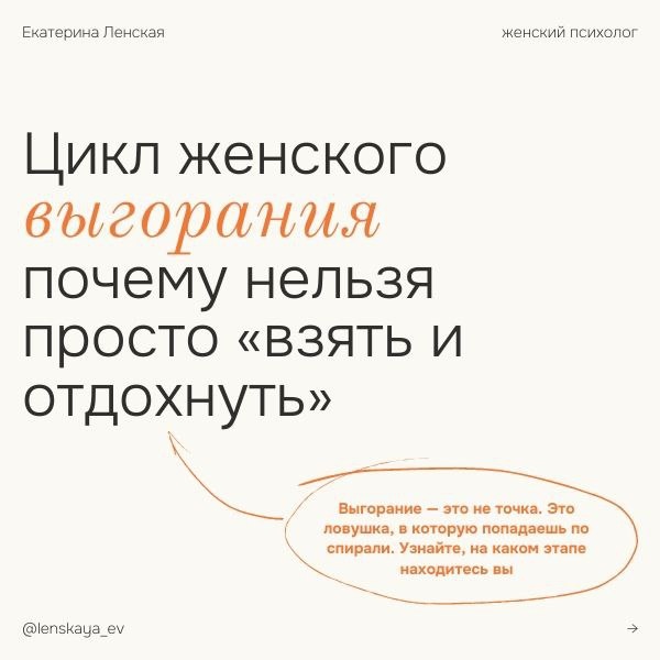 Цикл женского выгорания. Почему «взять себя в руки» не работает Вы когда-нибудь задумывались, почему просто отдых на выходных не помогает? Потому что выгорание — это не событие, а процесс. Система, которая затягивает, как воронка. В этой карусели я разбираю 5 стадий этого цикла: 💫 Энтузиазм - где мы теряем связь со своими границами. 🫠 Истощение - где мы игнорируем первые тревожные звоночки. 🧱 Стена - где мы теряем интерес ко всему. 🕳 Апатия - где наступает пустота и нет сил даже на простые вещи. 😣 Вина - где мы начинаем винить себя во всем. Понимание этого механизма — ключ к выходу. Перестаньте винить себя в «слабости». Вы не слабая — вы истощены системой, которую пора менять. P.S. Чек-лист «5 первых шагов для выхода из выгорания» — это ваш инструмент, чтобы начать менять систему уже сегодня. Напишите в сообщения группы vk.me/hellook слово ВЫГОРАНИЕ в комментариях, и я отправлю его вам в личные сообщения. Ваш психолог Екатерина Ленская https://psiholog-lenskaya-ev.ru 💖