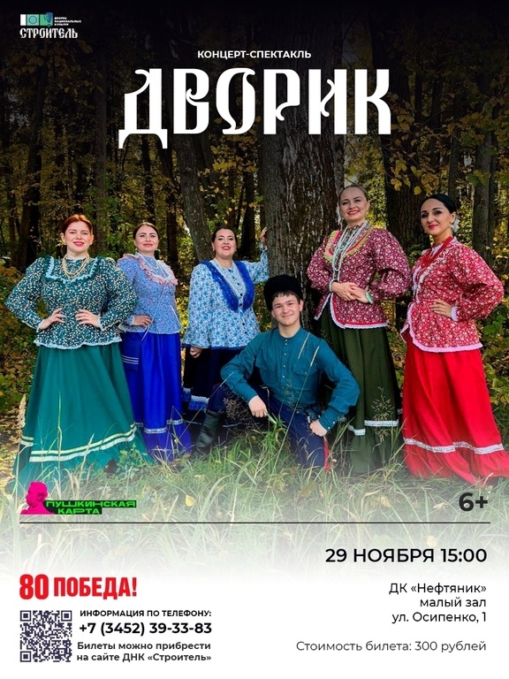 Концерт-спектакль «Дворик» ⏳ Когда: 29 ноября в 15:00 🔎 Где: ДК «Нефтяник» 📌 Стоимость: 300 рублей 6+ 🎭 Приглашаем на концерт-спектакль «Дворик: продолжение…» 🌿 Откройте двери в мир добрососедства, теплых воспоминаний и задушевных мелодий! Концерт-спектакль «Дворик: продолжение…» — это продолжение трогательной истории о людях, объединённых музыкой, добротой и душевным теплом. На сцене — народный ансамбль «Златоцвет» и Дарья Чехомова, которые пригласят зрителей в уютный дворик, где оживают знакомые каждому истории, а каждая песня становится частью общей памяти. В этот вечер Малый зал ДК «Нефтяник» наполнится искренностью и атмосферой домашнего уюта. Артисты исполнят любимые мелодии и расскажут истории, отзывающиеся в сердце каждого. ✨ Особым украшением программы станет выступление ансамбля народно-сценического танца «Субботея» (руководитель — Сергей Змановский), фолк-студии «Традиции» (руководитель — Дарья Чехомова) и Хореографический ансамбль «Серпантин», (руководитель — Еле
