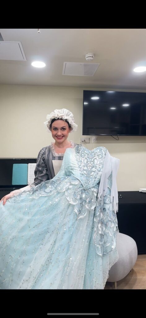 В гримёрной перед премьерой — пространство, где свет мягко ложится на бархат и атлас. На вешалке висит мерцающее платье Золушки. На полу — туфельки, которые при первом взгляде кажутся лёгкими, но при примерке оказываются тяжёлыми, словно в них заключена сама сцена. За пианино, приглушённо блеснувшим фарфоровым светом лампы, сидит Цветана Омельчук в образе Анджелины; она протирает пыль с крышки инструмента — движение тихое, почти ритуальное. В её жесте есть терпение служанки и грация принцессы одновременно.