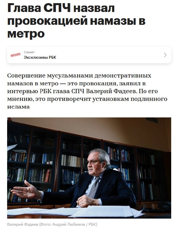 🛑 Намаз в метро — это политическая провокация, а не вера. Глава СПЧ Валерий Фадеев назвал публичные молитвы в подземке и за рулем автобусов спланированной акцией, а не религиозной необходимостью. По его словам, коврики на грязном полу выглядят вызывающе и противоречат «установкам подлинного ислама». Фадеев уверен: такие демонстративные действия нацелены на «не очень грамотных людей», чтобы использовать их для раскачки ситуации. Чиновник сравнил водителей маршруток с хирургами — врач ведь не бросает пациента на столе ради молитвы. Решать проблему в СПЧ предлагают не дубинками, а словом. Заниматься просвещением и объяснять неуместность таких обрядов должны авторитетные исламские деятели.